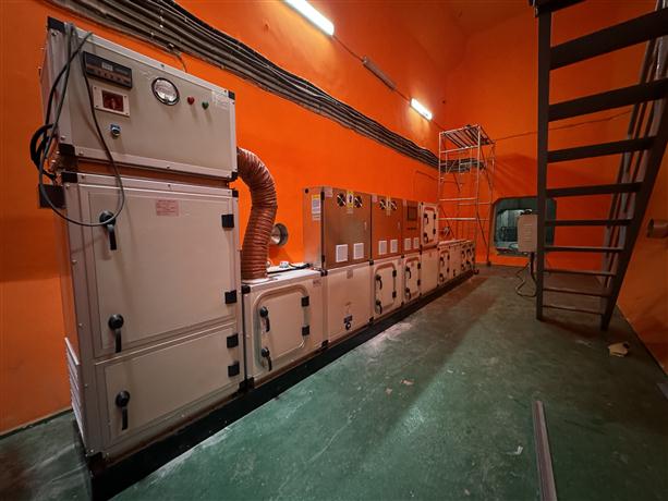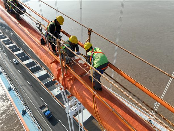 只見在西堠門大橋主塔塔頂,工作人員將模塊化的除濕設(shè)備一個個組裝起來,放在塔頂上橫梁位置。之后,開啟除濕機,干燥空氣從主塔塔頂?shù)目諝庵苽湔局休敵?,?jīng)由送氣管道到達(dá)全橋所有主纜內(nèi)部,最后在排氣夾排出,保障主纜鋼絲不發(fā)生腐蝕現(xiàn)象?!斑@次在主塔兩側(cè)一共安裝4組除濕機,每一側(cè)安裝兩組,一組主設(shè)備一組備用設(shè)備,確保除濕功能的持續(xù)性?!敝凵焦芾碇行捻椖控?fù)責(zé)人說。傳統(tǒng)除濕機組只有一臺主設(shè)備,為保障除濕功能的連續(xù)性,滿足長時間除濕的需求,橋梁養(yǎng)護(hù)工作人員設(shè)計了一主一備并聯(lián)型除濕機組。日常以傳統(tǒng)除濕機組即主除濕機組工作為主,高溫高濕環(huán)境下,視情況啟用備用機組,或同時開啟主、備用機組,提升除濕效率。此外,該備用除濕機組是橋梁養(yǎng)護(hù)工作人員自主研發(fā)的濃縮除濕機,采用“濃縮冷卻串聯(lián)”創(chuàng)新式除濕設(shè)計,屬國內(nèi)首創(chuàng),具備恒定除濕能力,基本不受季節(jié)等外界環(huán)境因素影響,確保在復(fù)雜的海洋氣候環(huán)境下,為主纜除濕工作提供更強力更有效的保障。